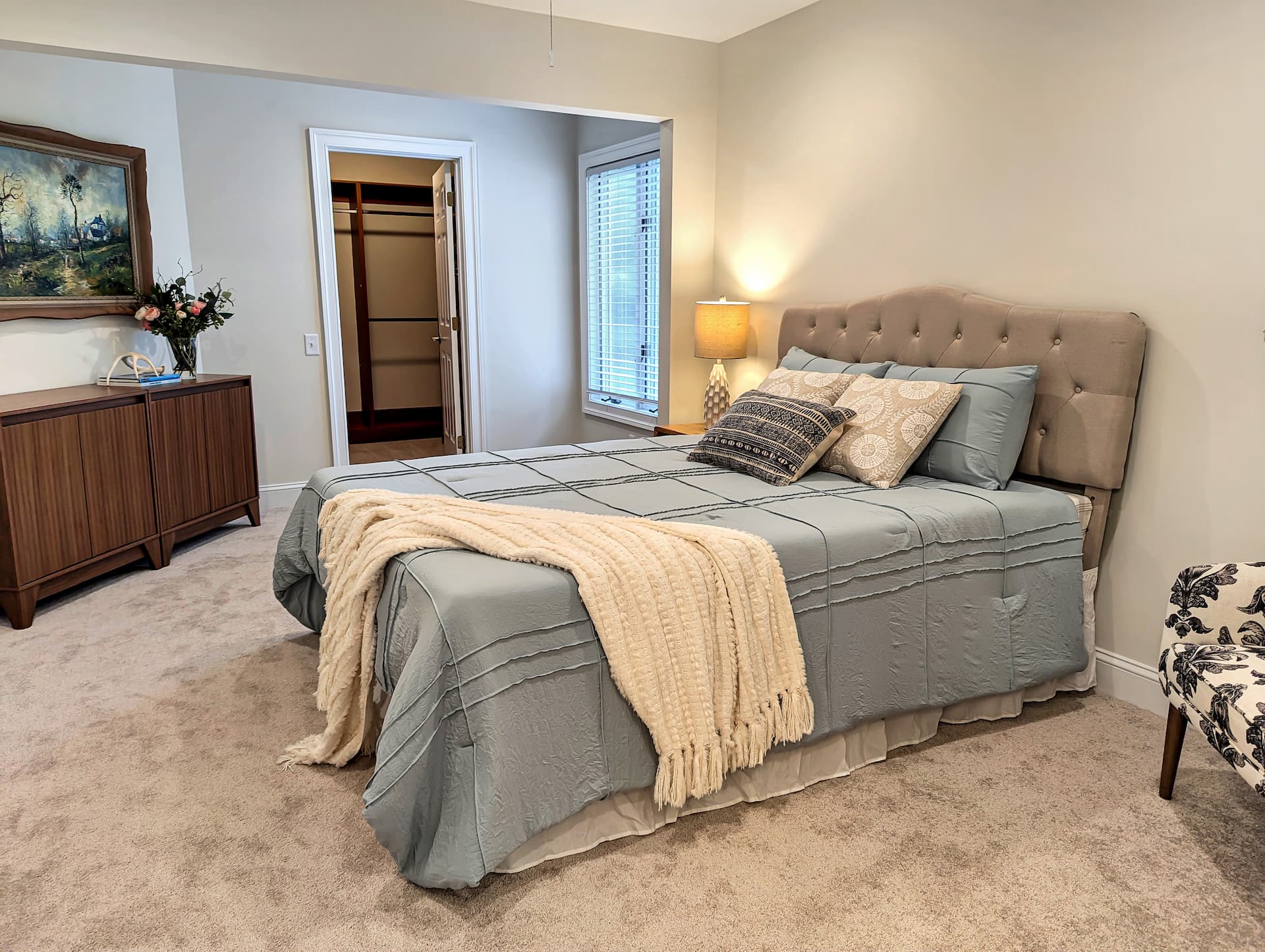 A third-floor apartment, this beautiful residence features a private balcony overlooking the trees and our Thomas Garden Patio. The spacious 1,120-square-foot floor plan includes two bedrooms and two full bathrooms, with the primary suite offering a generous walk-in closet.