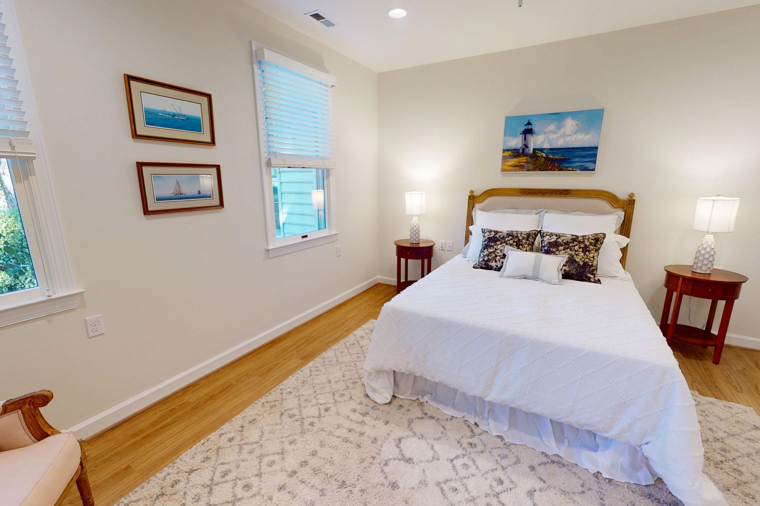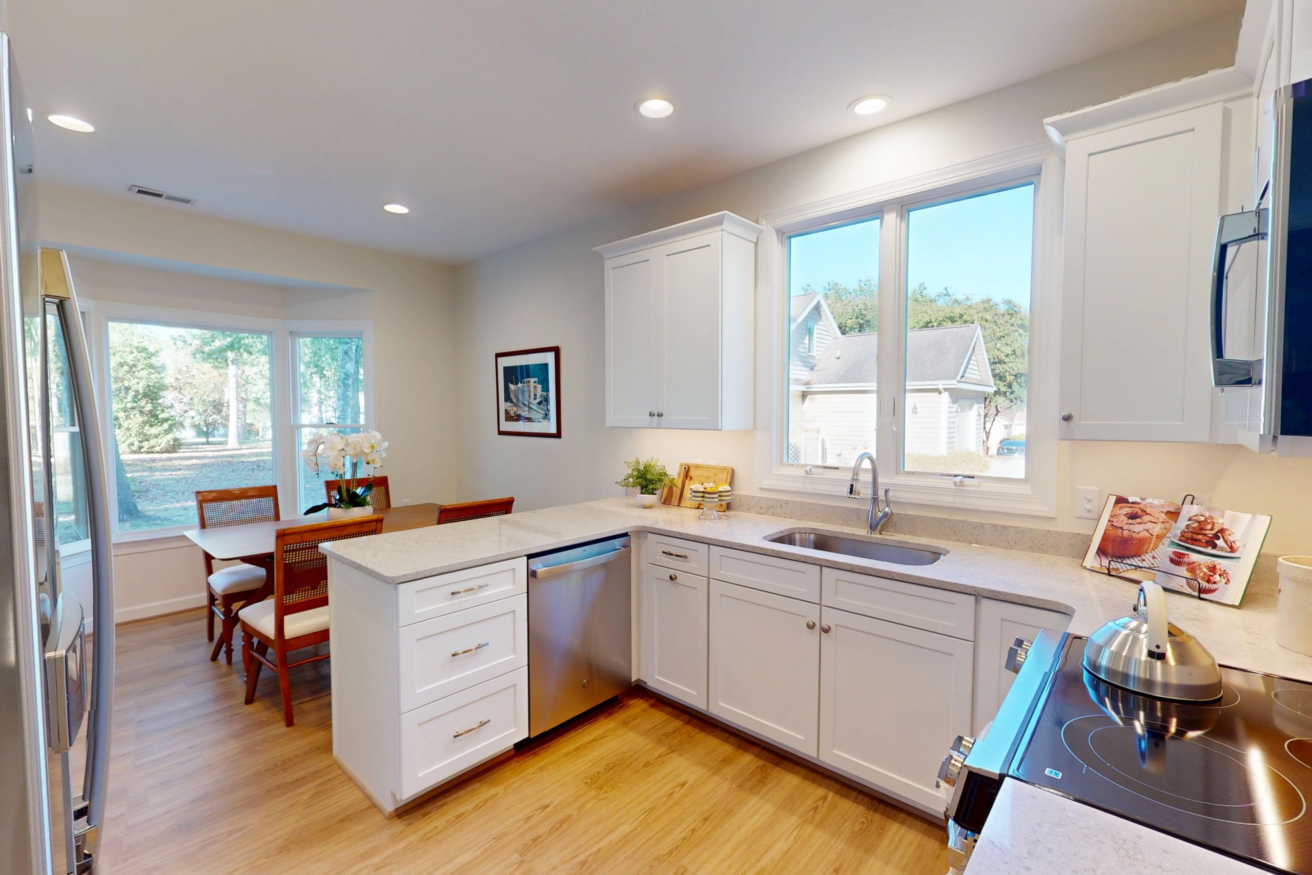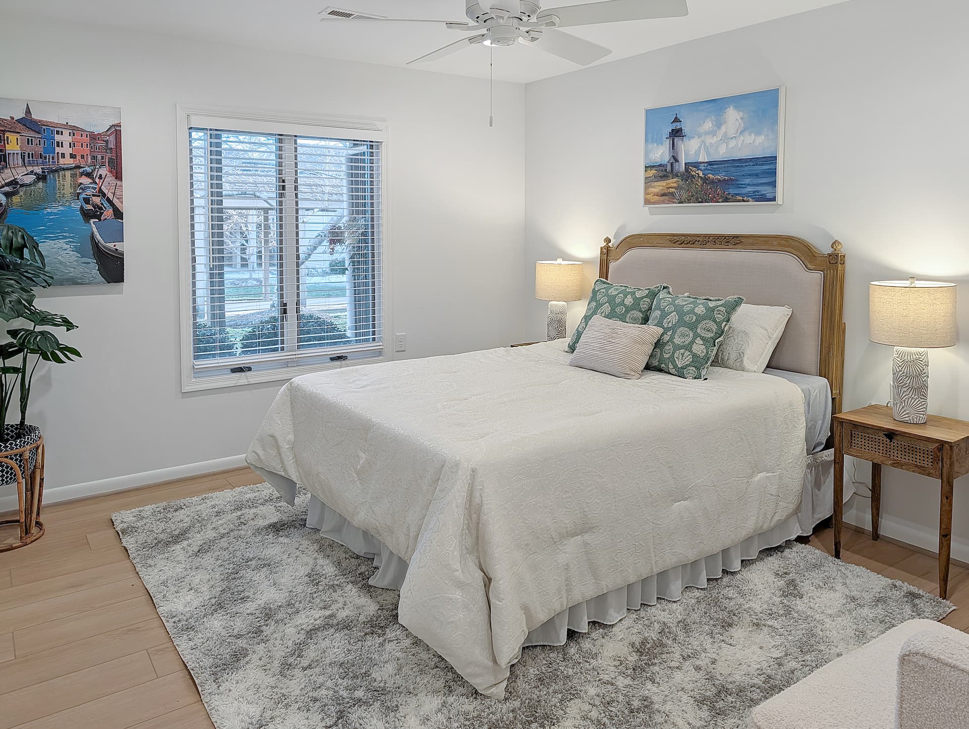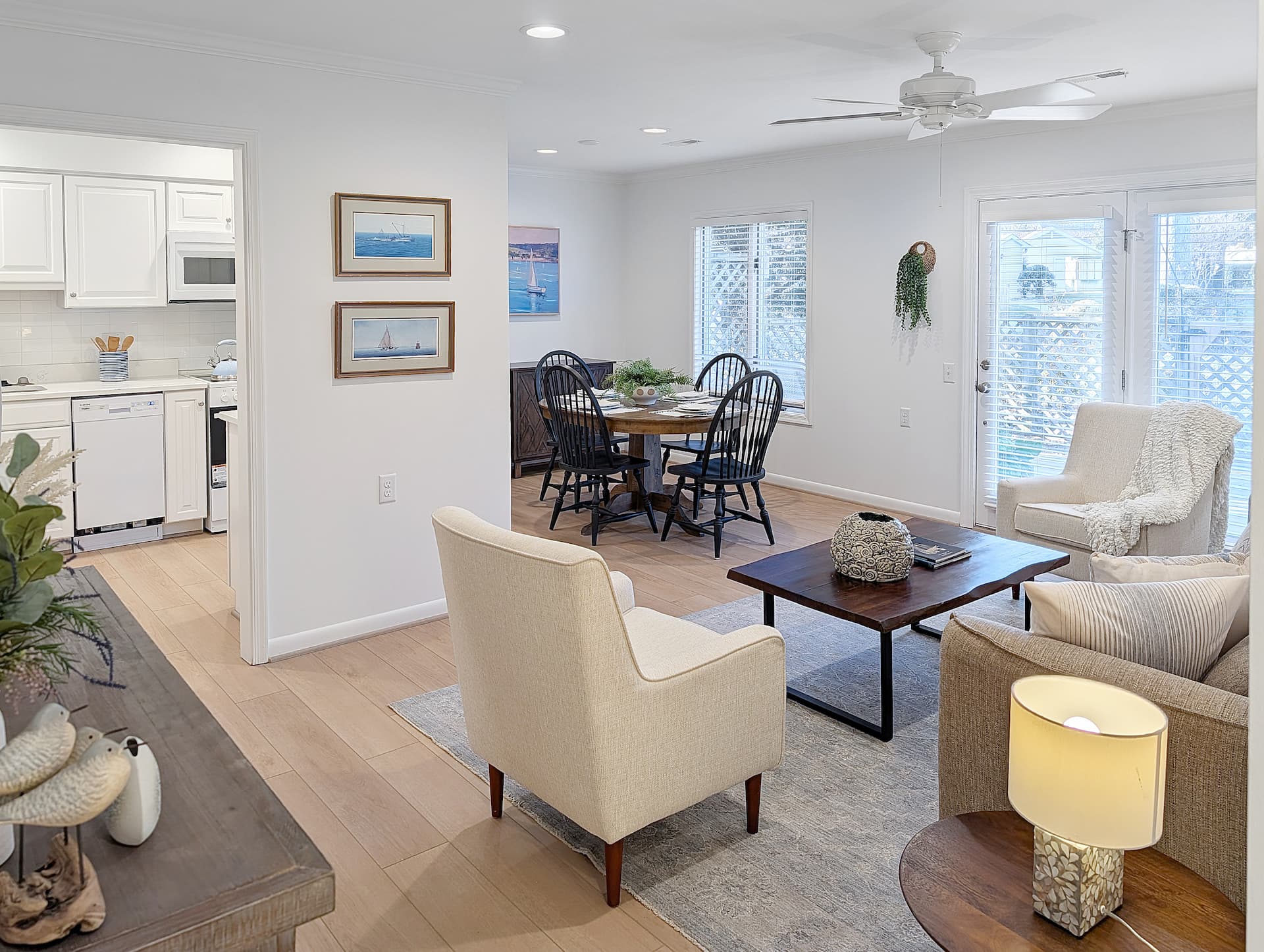 A beautifully updated 1,052-square-foot cottage featuring two bedrooms and one- and-a-half baths. The kitchen includes white cabinetry, white quartz countertops, and a white tile backsplash. New luxury vinyl plank flooring runs throughout, complemented by recessed lighting and a tile curbless walk-in shower.