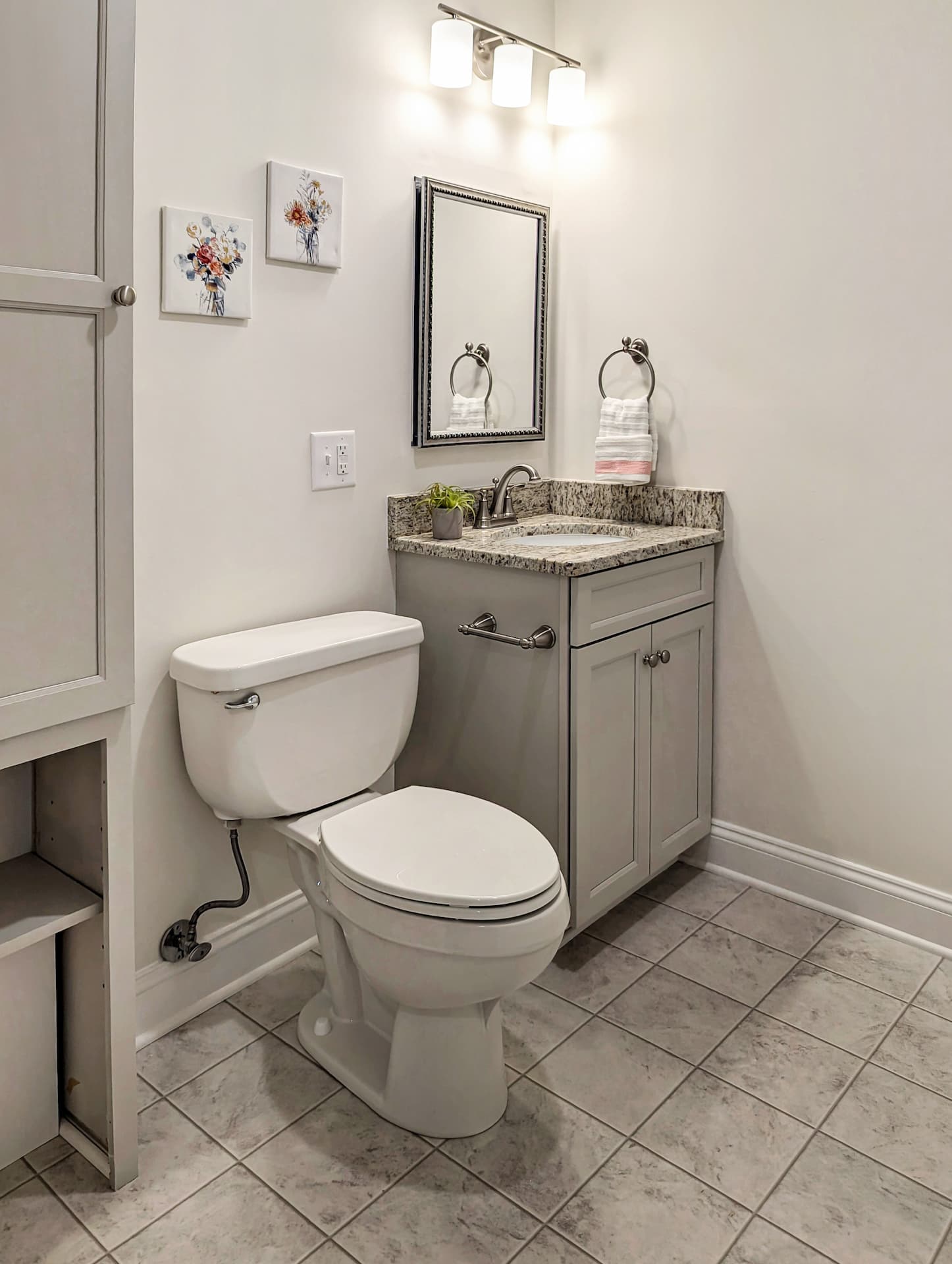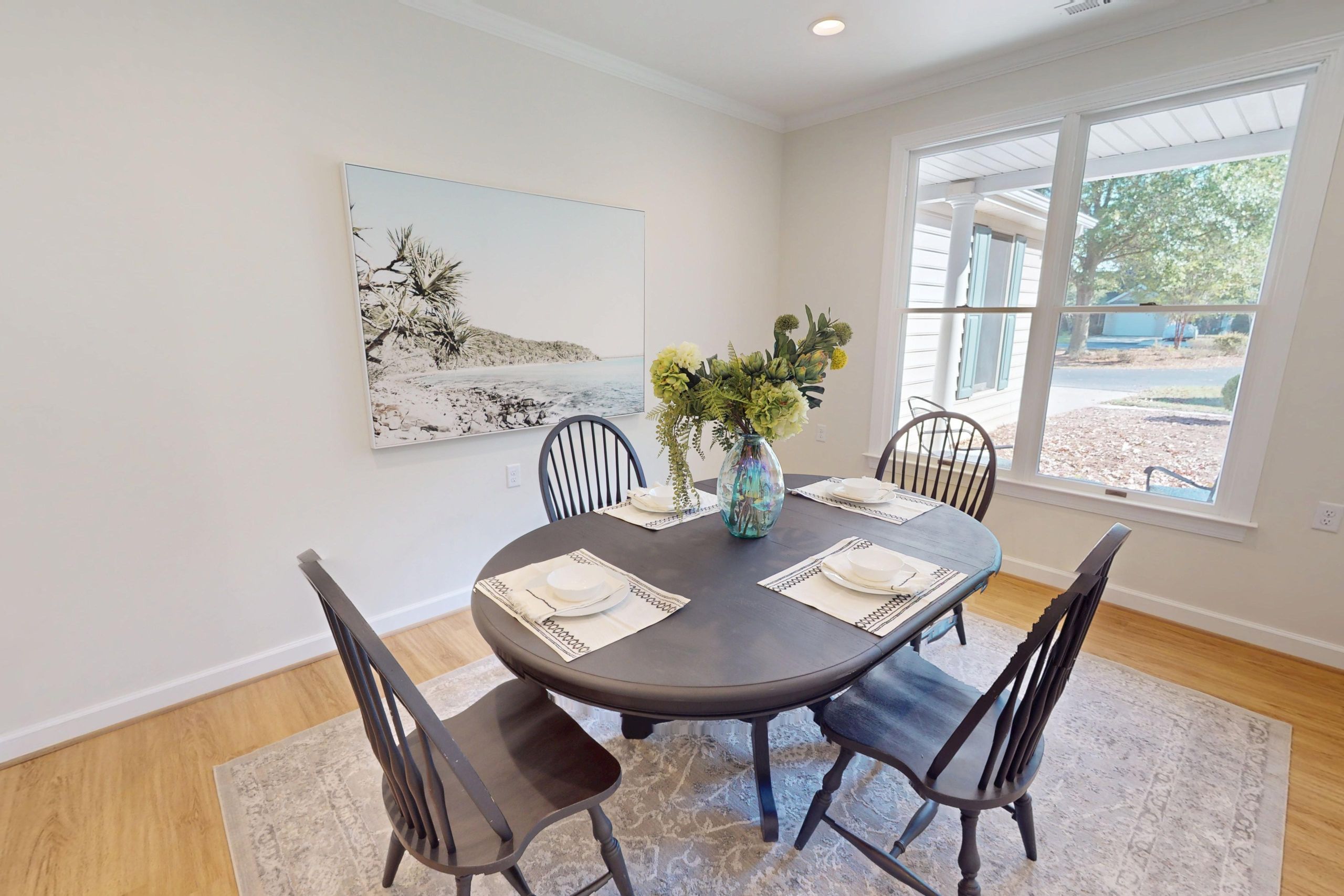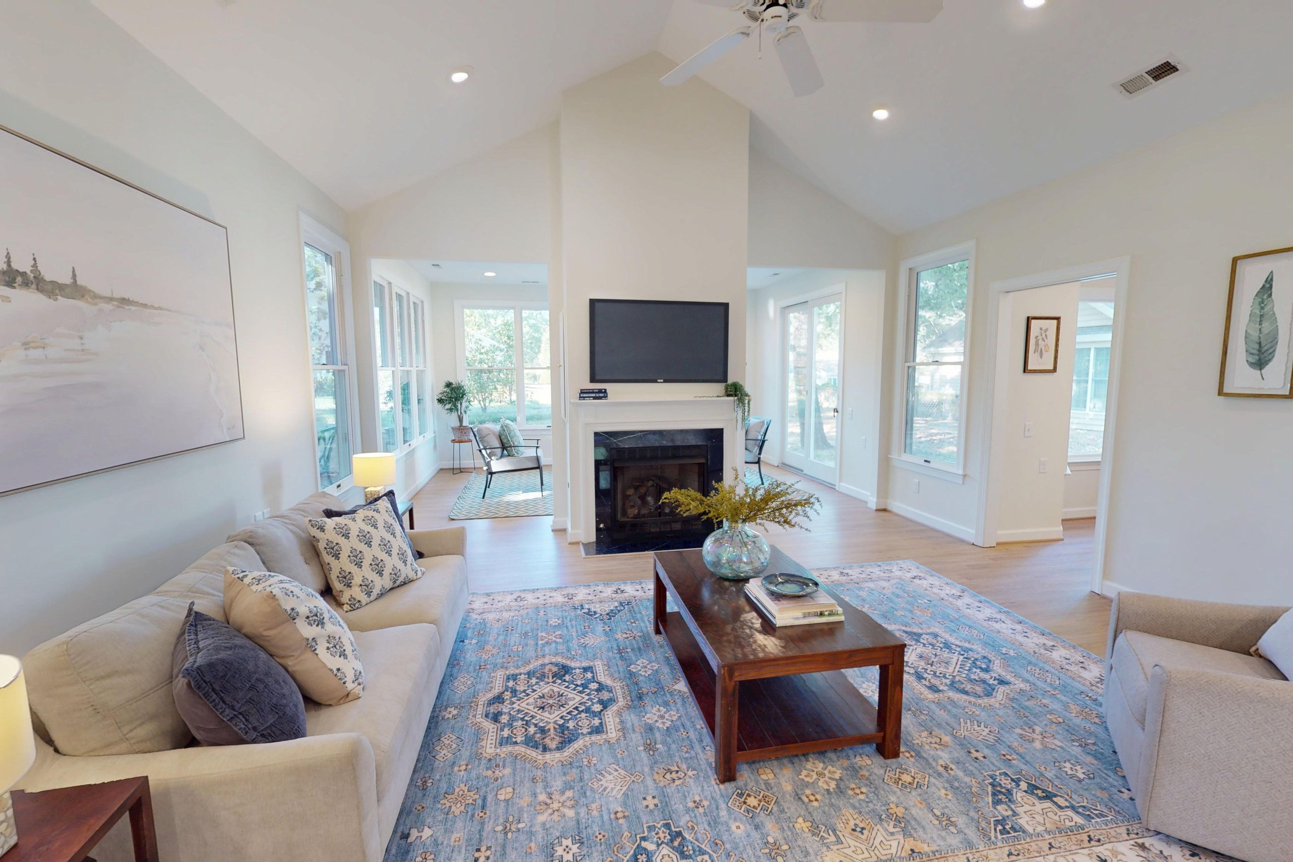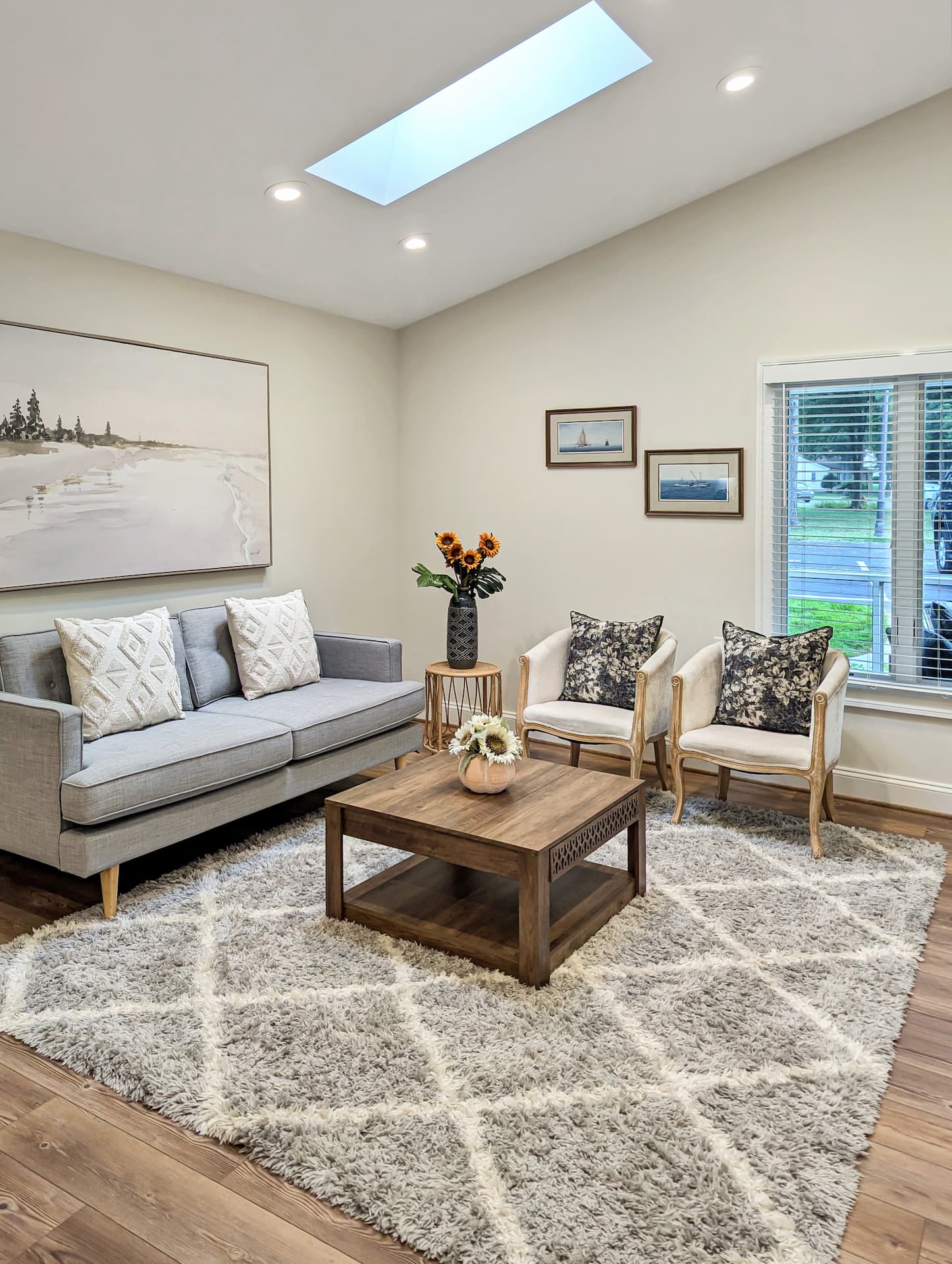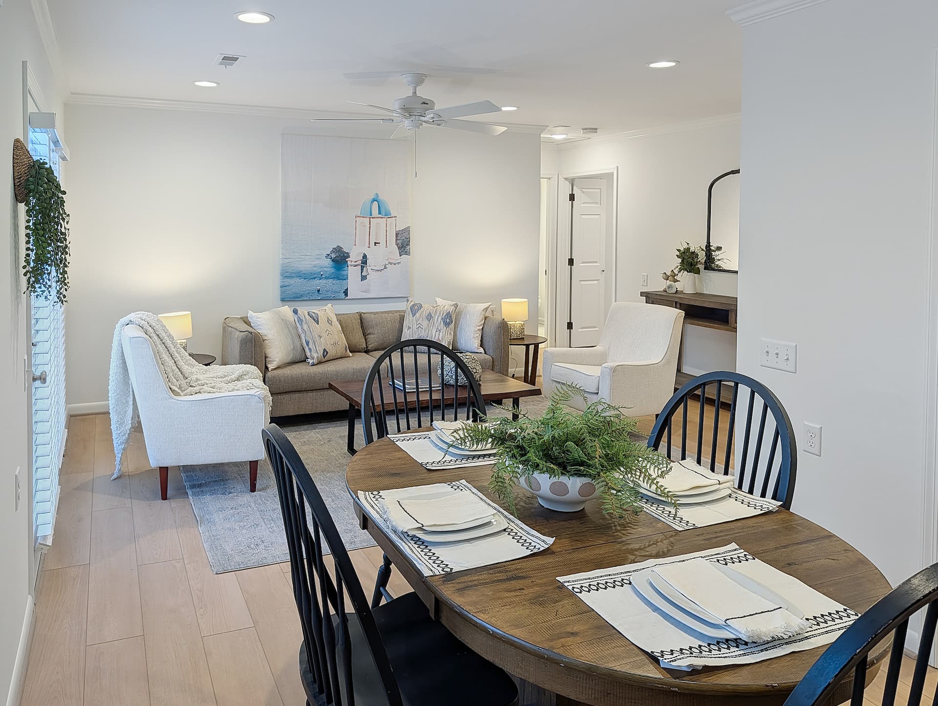 A beautifully updated 1,052-square-foot cottage featuring two bedrooms and one- and-a-half baths. The kitchen includes white cabinetry, white quartz countertops, and a white tile backsplash. New luxury vinyl plank flooring runs throughout, complemented by recessed lighting and a tile curbless walk-in shower.